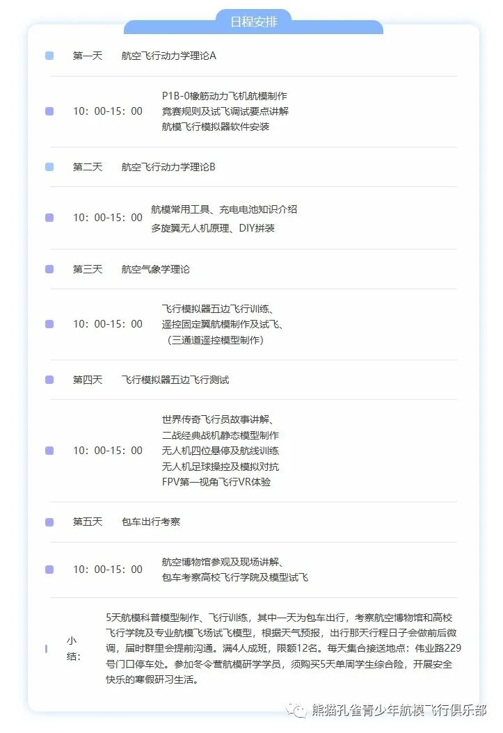 地点 闵行伟业路航模教室、浦江飞行基地课程介绍橡筋动力机、追梦者电动遥控固定翼机、天鸽一号无人机、法国Parrot Mambo无人机制作、飞行模拟器、穿越机构成及工作原理、无人机航拍入门、趣味航模飞行竞赛、上海直升机救援中心及机场基地考察、*太阳能无人机与水陆两栖基地考察、*三角翼电动操控等!(*竞赛提高班)