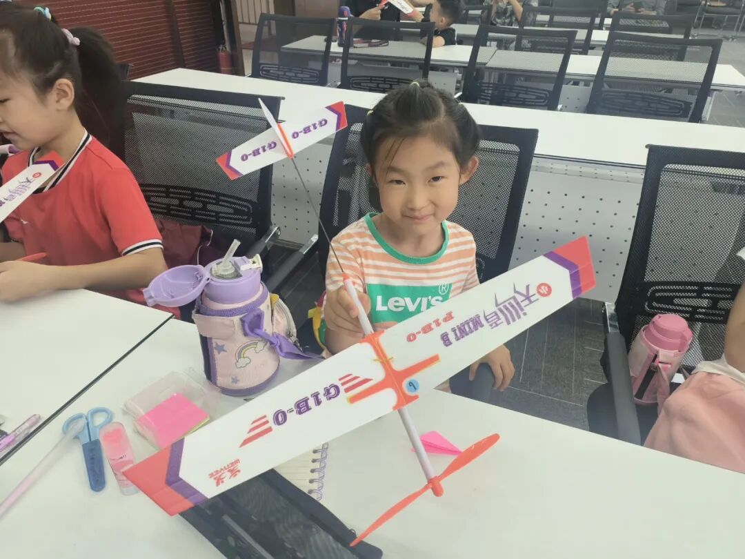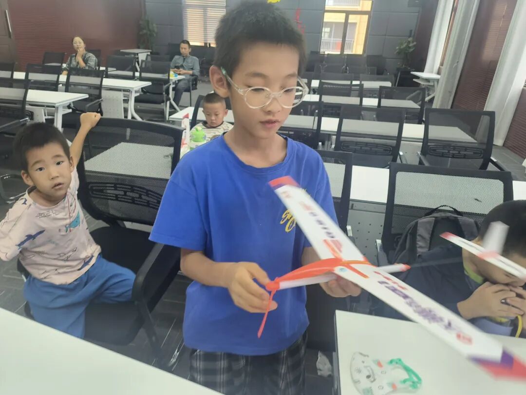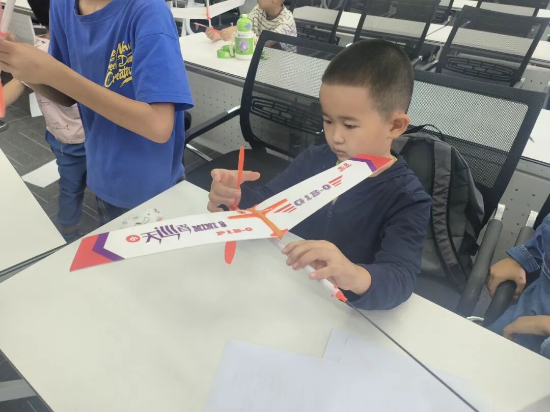 在DIY航模制作环节,孩子们迫不及待地打开材料包,跟随着航模老师的脚步逐步进行组装。“这是飞机的尾翼,可以用来控制飞行的姿态,机翼对于飞机,就像鸟儿拥有了翅膀。”航模老师一边指导小朋友组装飞机主支架、机翼、尾翼、螺旋桨等部件,一边深入浅出地讲解了航模飞行原理、机身结构、航模用途等知识。