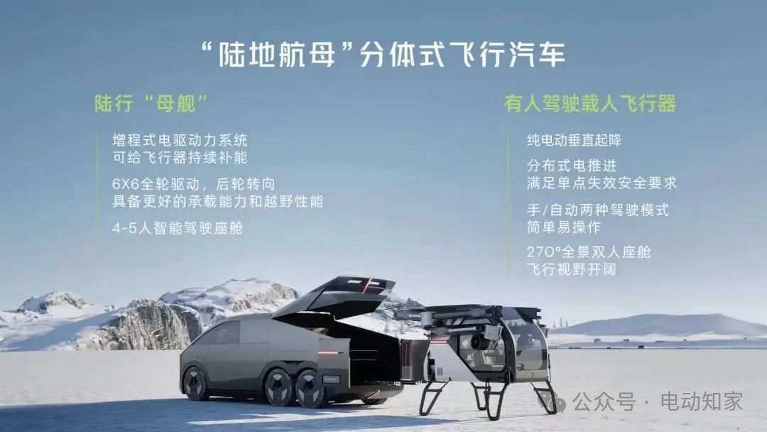 参数方面,陆地航母”的陆行体部分又称陆行“母舰”,可以容纳4-5名乘客,配备了全球首个800V碳化硅增程动力平台,综合续航(CLTC)1000公里,采用三轴六轮设计,实现6×6全轮驱动,并具备后轮转向和空气悬架等功能,转弯半径小于13米。在满油满电的情况下可以支撑6次飞行。