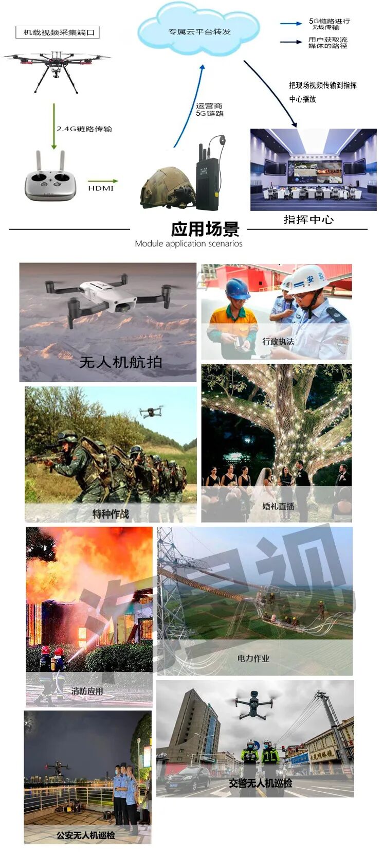 由于无人机配套的飞控和微波图传,只有有限的10km的图传距离,对于要远程实时监控监测的单位应用,这个距离是远远不够的。那么可在标配的短距离的微波图传之外,增补我们的5G无线图传设备,可将航拍的图像实时传送到无限距离之外的监控中心去,实现远程实时预览,应急指挥调度。