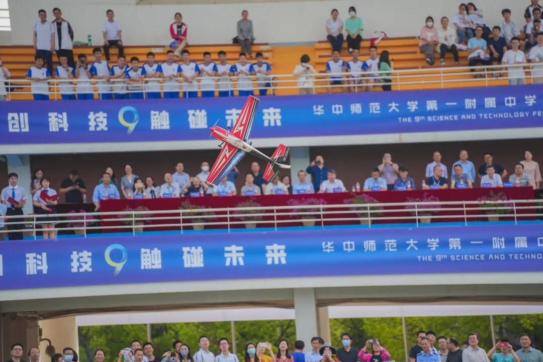 最后起飞的也是华中师大一附中的同学们操纵的无人机,随着无人机高度的上升,我们看到它拉起了红色的条幅,预祝华中师大一附中第九届科技节圆满成功!