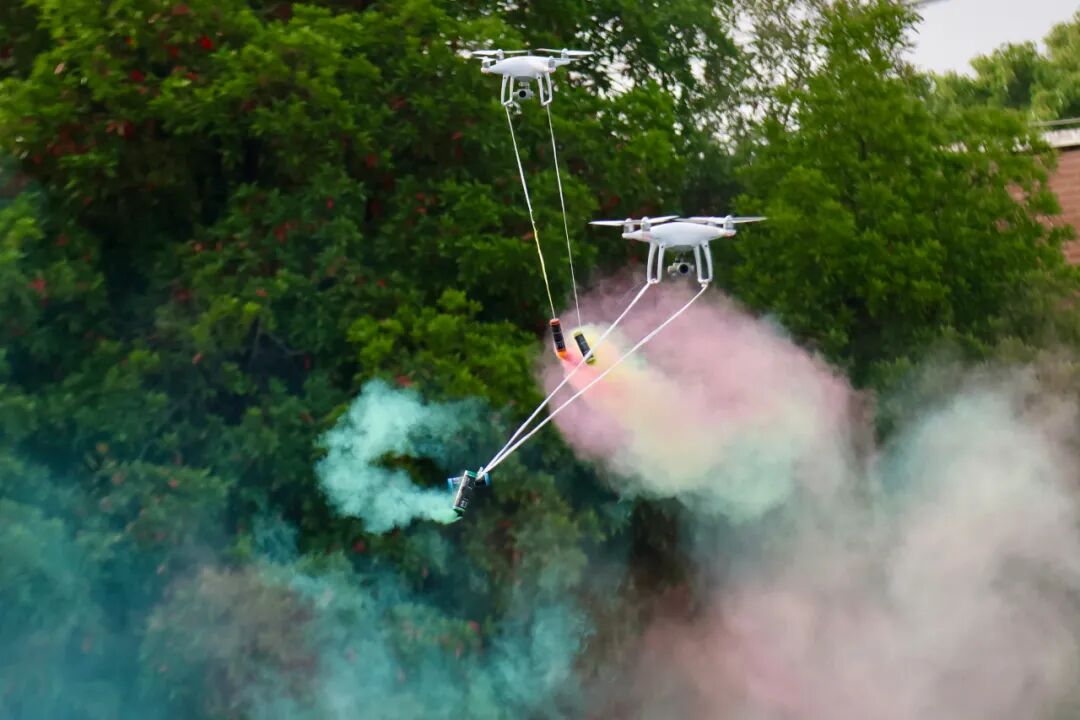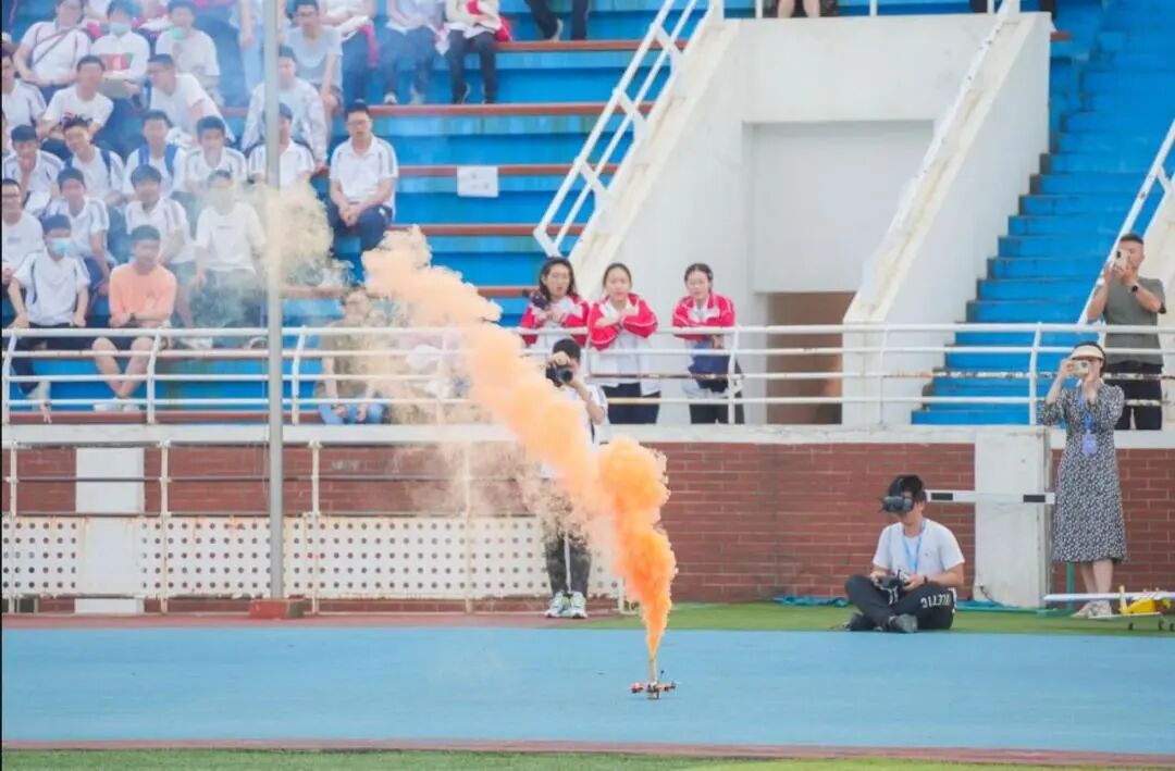 第四个项目,由华中师大一附中的同学操作无人机进行拉烟表演,七彩的烟雾成为运动场上一道绚丽的风景。
