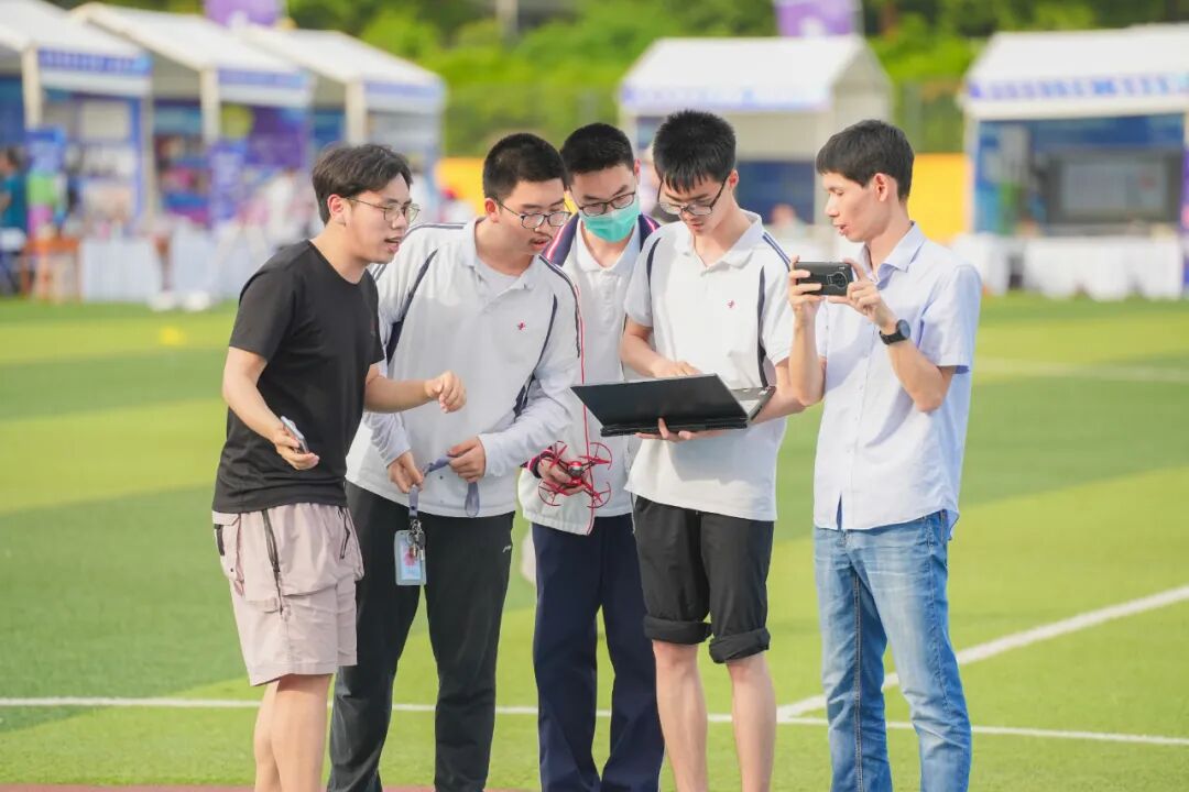 “快看,飞机在天上对战!”开幕式上,华中科技大学带来的航模多机空战演习赢得了阵阵掌声。五架尾部挂着黄色或红色长丝带的航模,依次从操场跑道上升空。它们相互追逐,尝试用自己的机身、桨叶去切开对手身后的飘带。只见,在高校学生的操控下,最先升空的挂着黄色长丝带的航模获得了首胜。