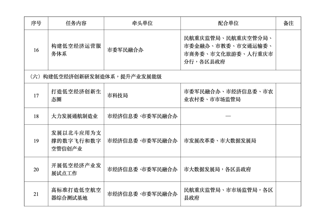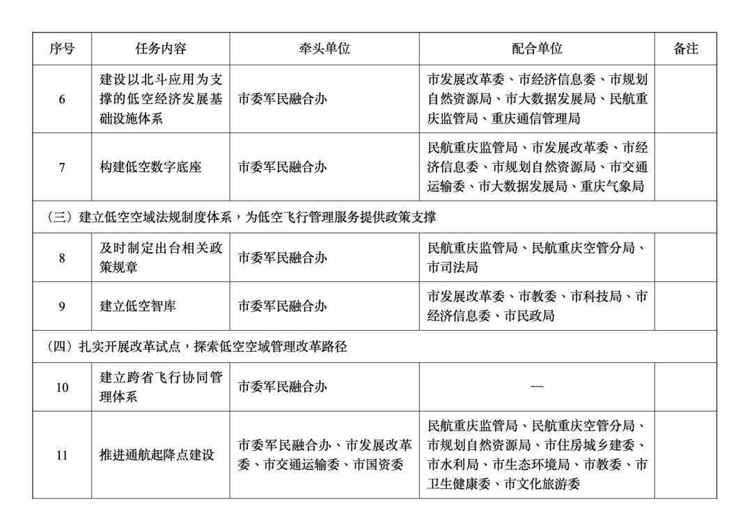 重庆市推动低空空域管理改革促进低空经济高质量发展行动方案(2024—2027年)为全面贯彻党中央、国务院关于深化低空空域管理改革、促进低空经济发展的决策部署,认真落实中央空中交通管理委员会关于深化低空空域管理改革的系列要求,探索构建军地民一体化协同管理低空空域资源新模式,开发建设以北斗应用为支撑的低空经济发展基础设施体系,促进全市低空经济高质量发展,结合我市实际,制定本行动方案。一、总体要求坚持“统筹兼顾、协同共建,需求牵引、滚动实施,市场主导、政府引导,改革引领、创新驱动”基本原则,构建可用低空空域资源最大化、协同管理机制顺畅、管理服务体系优质、空管数字底座强大、法规制度保障有力的“五大基座”,探索跨省低空飞行联盟新体系、低空飞行数字化管理新手段、飞行服务站一体化管理新机制、通航起降点建设新模式、空域要素定价新方式、低空领域标准体系建设新突破等具有全国引领性的“六大创新”,打造消费业态丰富、产业链条完整、创新生态活跃、通航文化精彩的“低空经济创新发展之城”。——到 2025年,低空空域管理改革取得突破性进展。以北斗应用为支撑的低空经济发展基础设施体系基本建成。新建通航起降点 200个以上,实现低空飞行“县县通”,“干支通”机场及临时起降点全面实现互联互通。市、区县(自治县,以下简称区县)两级低空飞行服务站和保障设施基本建成。建成试飞试验基地 3个以上。政务服务、行业应用和消费市场等示范应用场景趋于成熟。通用航空器整机制造能力快速提升,建成研发平台 3个以上,初步构建我市低空经济创新研发制造体系。全市低空飞行器数量增长 15%以上,飞行架次、飞行时长增长 20%以上。新增通航制造业投资 100亿元以上,低空经济市场主体数量达到 400家,其中制造业类 150家、消费运营类 250家。——到 2027年,低空空域管理改革的战略支撑和先行先试作用更加凸显。以北斗应用为支撑的城市空中交通空机一体化管理系统基本建成。新建通航起降点 1500个以上,实现低空飞行“乡乡通”。数字空管技术取得新突破,低空空域管理更加精细化。低空飞行应用场景全面覆盖应急救援、物流配送、城市通勤等领域。低空产业能级不断提升,研发生产能力持续增强,低空空域利用率进入全国前列,“六大创新”取得阶段性成效。低空飞行器数量年均增长 20%以上,飞行架次、飞行时长年均增长 25%以上。新增通航制造业投资 200亿元以上,低空经济市场主体数量达到1000家,其中制造业类400家、消费运营类 600家。二、主要任务(一)构建军地民协同管理工作体系,分步实现低空空域资源利用最大化1.强化市级统筹。建立重庆市低空空域协同管理工作专项协调机制,组建工作专班,构建跨军地、跨部门、跨行业、跨区域的管理工作体系,形成全市“一盘棋”工作格局。2.强化军地民协同。创新空域资源管理模式,军地民三方共同制定协同管理工作规则及制度规范,建立高效顺畅的军地民一体化协同管理工作机制。3.编制低空空域规划。依据《国家空域基础分类方法》,编制低空空域规划方案,分高度层、时间段灵活使用低空空域资源,根据发展需要逐步扩大融合飞行空域范围。建立低空空域使用情况评估与改进机制,形成“运行使用—效率评估—动态调整”工作闭环,不断提高低空空域使用效率。4.优化审批制度。推动低空空域资源市级统筹,实现一般空域需求统报统批、特殊空域需求特报速批,形成“动态管理、灵活转换”的空域使用模式。加强与民航西南管理局等单位空域管理工作协同,优化飞行活动审批程序,压缩审批时间。(二)构建低空飞行管理服务体系,探索数字空管新模式,持续提升低空空域管理服务能力5.创新低空飞行服务站管理机制。建立由市、区县两级直管的低空飞行服务站管理机制,布局构建“1+N+X”低空飞行管理服务机构体系(即1个A类飞行服务站,N个B类飞行服务站,X个低空通信监视基站),建立与中国民用航空局民用无人驾驶航空器综合管理平台(UOM)、市无人机公共安全监管中心的数据共享机制,实现低空飞行全市覆盖、全域统管,飞行申请一网通办、一键送达,管理、服务、救援一体运行。6.建设以北斗应用为支撑的低空经济发展基础设施体系。探索低空飞行数字空管新模式,加快低空经济发展基础设施相关硬件、软件、标准、制度、管理平台建设,形成完整体系。构建城市空中交通空机一体化管理系统,建立数据共享平台,探索空域资源要素定价及结算规则。7.构建低空数字底座。开展空域环境普查,编制低空目视航图、低空目视飞行细则。推动数字低空建设,整合三维地理信息、城市信息模型(CIM)、低空飞行空域、气象等数据资源,打造一体化低空数字底座。(三)建立低空空域法规制度体系,为低空飞行管理服务提供政策支撑8.及时制定出台相关政策规章。适应低空经济新领域新业态新变化,制定出台低空领域相关规章或规范性文件,逐步形成实时更新、完善配套的政策规章体系。9.建立低空智库。支持设立低空经济专家咨询委员会,引导企业、高校、科研机构、新型智库等组织积极参与全市低空经济产业发展。加强对低空经济领域行业协会的业务指导,支持成立产业联合会等社会组织。(四)扎实开展改革试点,探索低空空域管理改革路