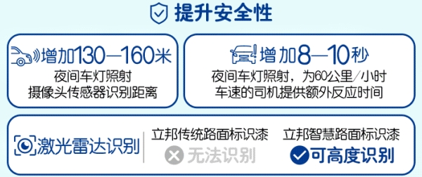 在夜间车灯照射条件下,智慧路面标识漆的识别距离在原有基础上可增加130到160 米。在车速为每小时 60 公里的情形下,这项新材料理论上能为司机增加 8 到 10 秒左右的反应时间,此外,相较于传统水性路标漆,在同等用量的情况下,该产品的使用寿命可以增加3-4倍。
