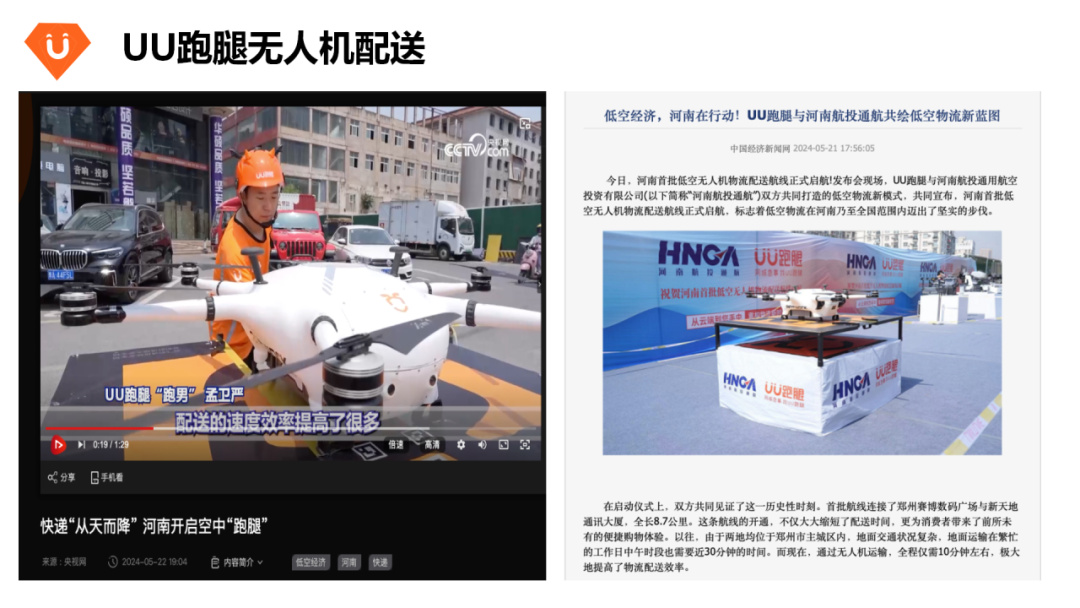 完善的生态体系。UU具备完整的同城配送生态体系,能够快速接入低空配送,提供除无人机配送之外的物流基建支撑。