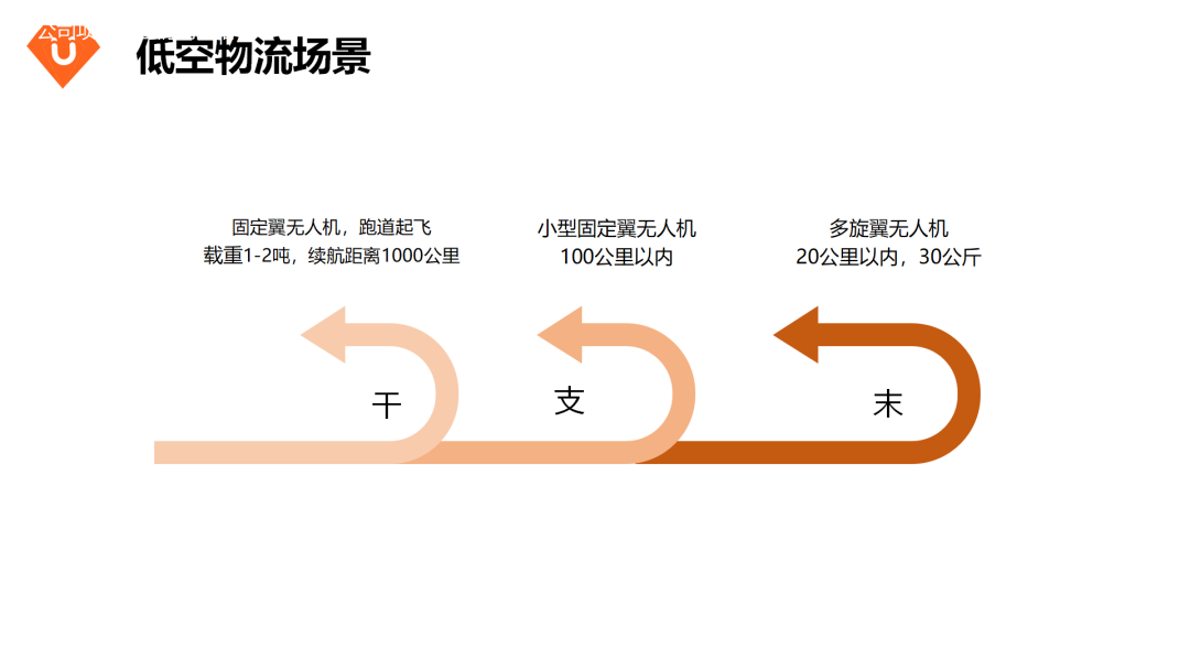 大家从这两张图可以明显的看出来低空的物流跟传统物流的区别。传统的物流受限于地面的交通情况,但是当上升到空中之后,它不是简单的交通工具的一个提升,更多的是一种模式上的一种创新,我们可以在不同的高度飞行不同的飞机,搭载不同的载荷,可以实现多样化的物品的配送。